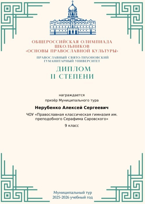 Ученик 9 класса Православной гимназии имени преподобного Серафима Саровского Алексей Нерубенко среди призёров муниципального тура «Общероссийской олимпиады школьников» по дисциплине «Основы православной культуры».
