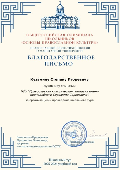 Благодарственным письмом организаторов отмечен и духовник Православной гимназии иерей Стефан Кузьмин за организацию и проведение школьного тура Олимпиады.