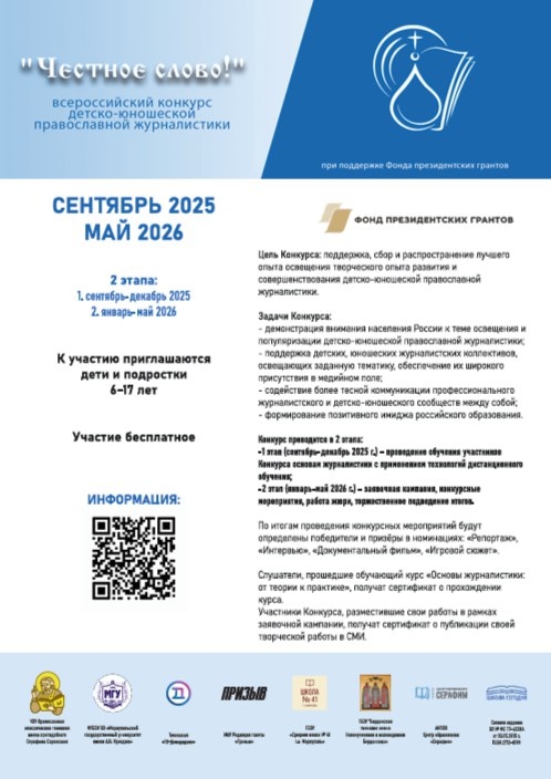 Всероссийский конкурс детско-юношеской православной журналистики «Честное Слово!» создан для обучения детей школьного возраста, заинтересованных в православной журналистике, основам профессии и проведения уникального конкурса, способствующего формированию молодежного онлайн-сообщества учащихся школ со здоровыми ценностями, которые хотели бы создавать информационный контент для православных сайтов и других интернет-площадок.