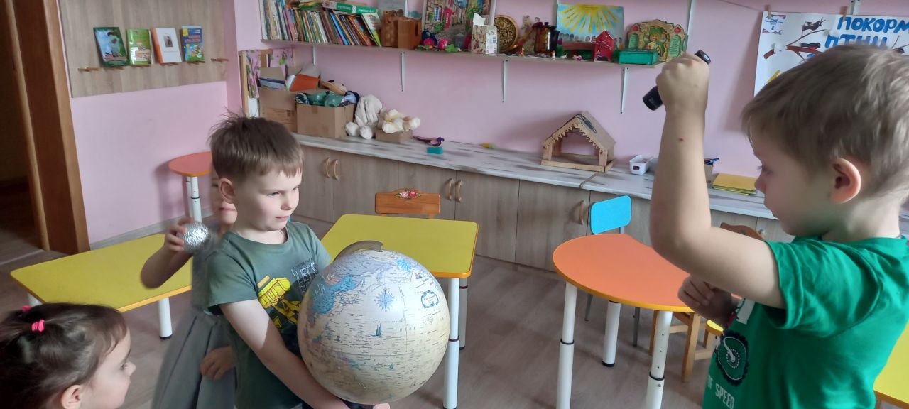 В третий день во время дидактической игры «Лесные этажи» изучали деревья, кустарники, травы, цветы. В четвёртый день творения говорили про небесные светила. Узнали о космических явлениях при помощи самых доступных вещей – фонарика, шаров разного размера, звёзд из фольги.