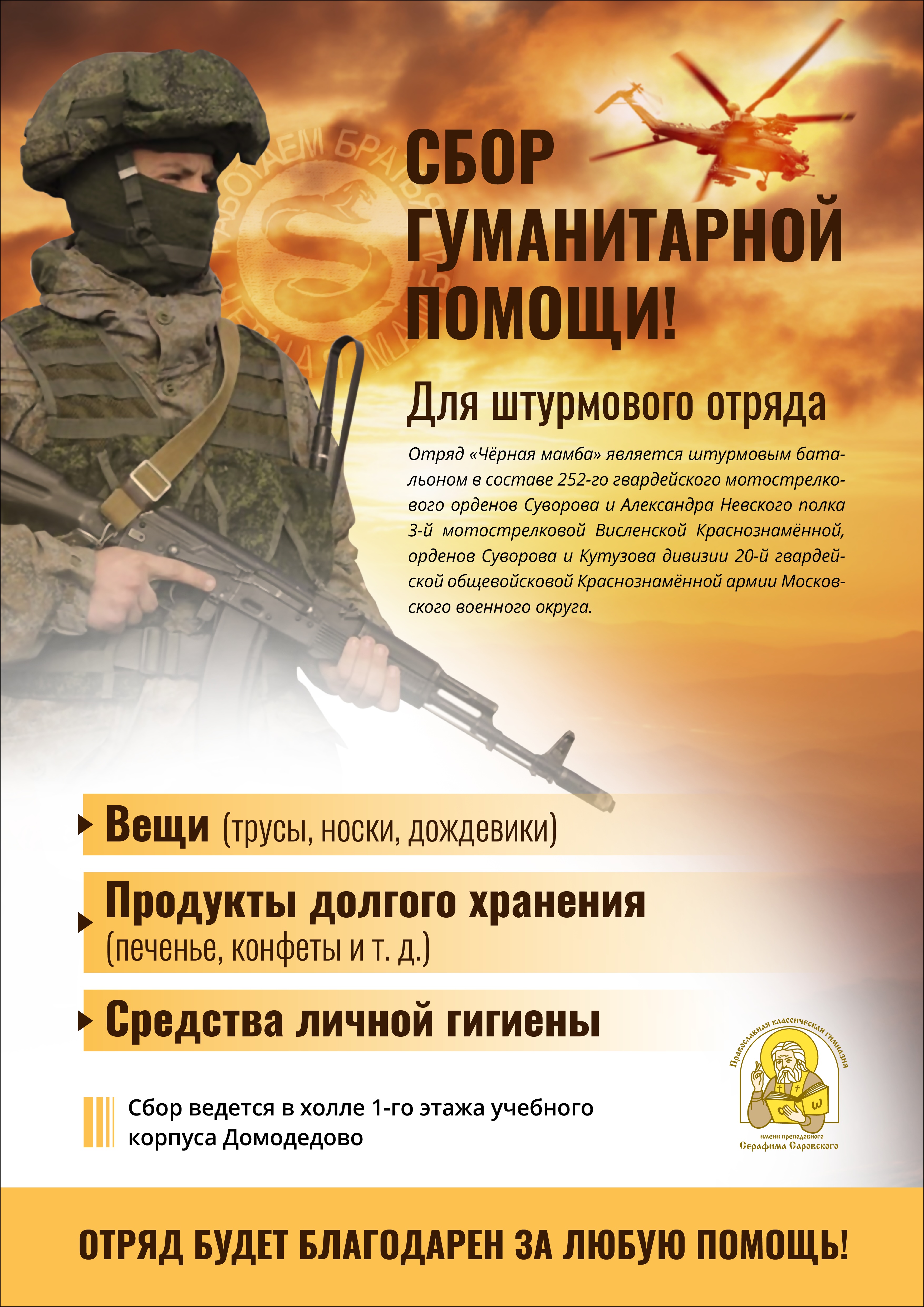 Гуманитарную помощь бойцам СВО из штурмового отряда «Чёрная мамба» собрали в Православной гимназии им. Преподобного Серафима Саровского. Педагоги, ученики и их родители сразу двух корпусов - Домодедовского и Сынковского - общими усилиями собрали несколько десятков коробок. Журналисты пресс-клуба «Серафим» узнали, что ещё, кроме провизии и средств гигиены, отправили на передовую.